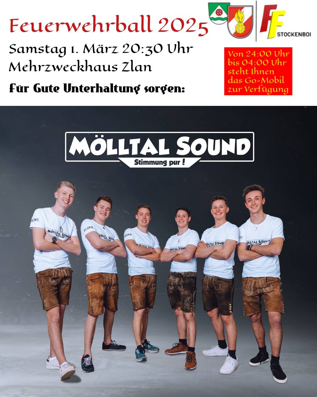 Eintritt: Vorverkauf: 7,- Abendkasse: 10,- Karten sind bei den Mitgliedern der Feuerwehr Stockenboi erhältlich